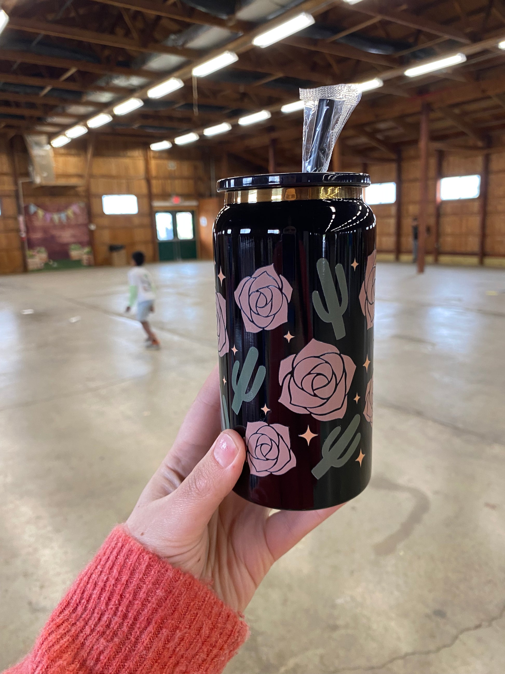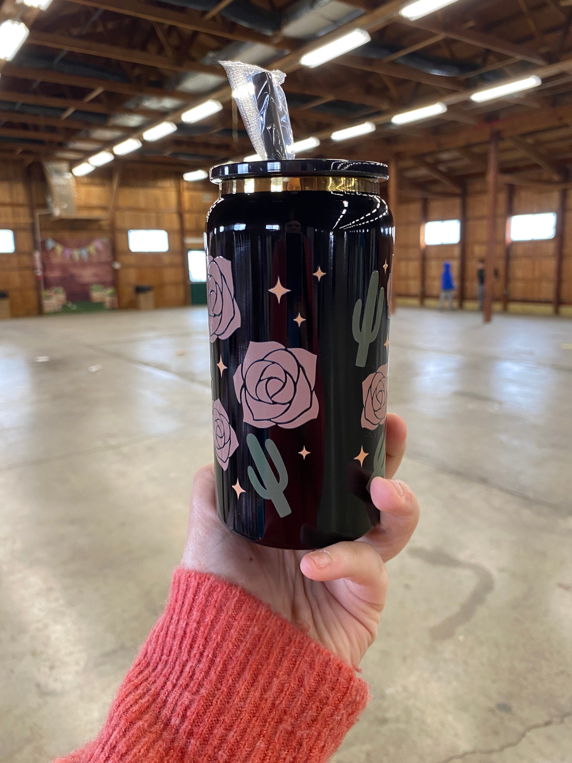 16 oz stainless steel cup. Comes with matching lid and straw. Hand wash only! Good for hot and cold beverages