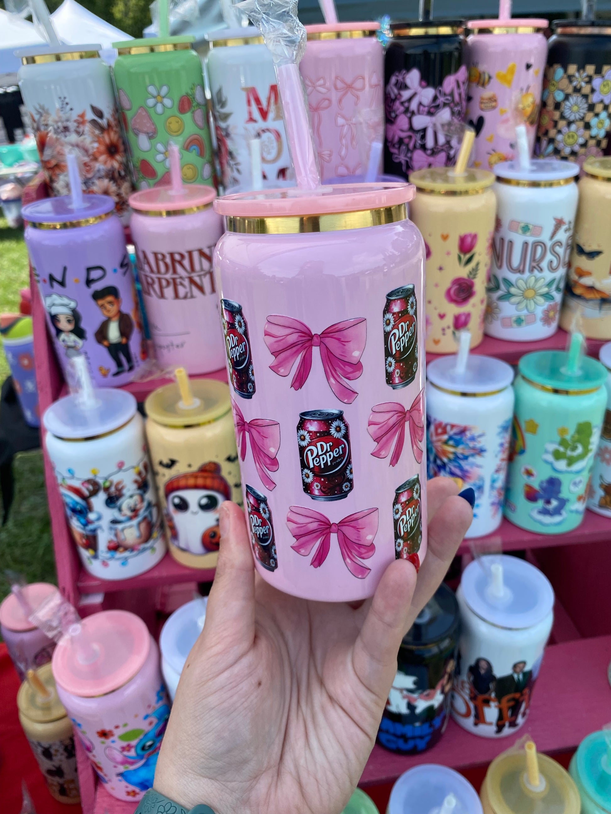 16 oz stainless steel cup. Comes with matching lid and straw. Hand wash only! Good for hot and cold beverages