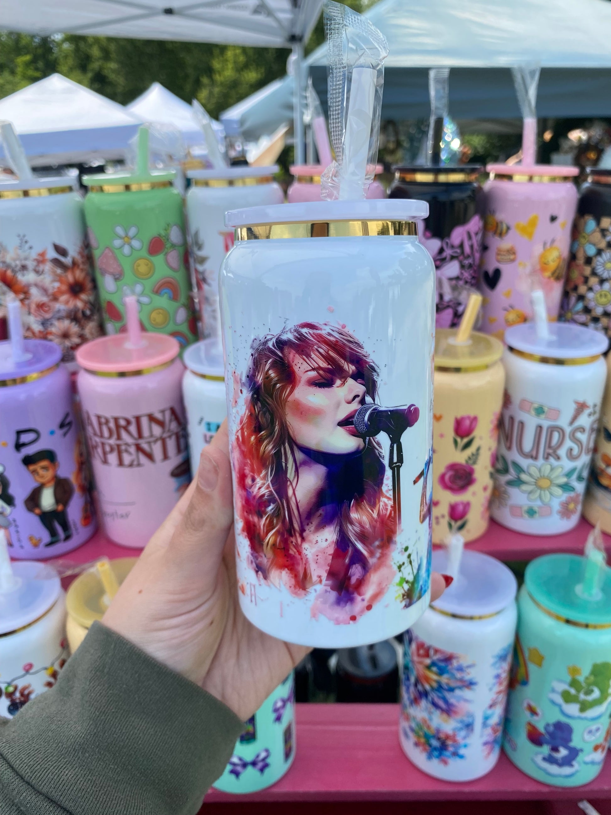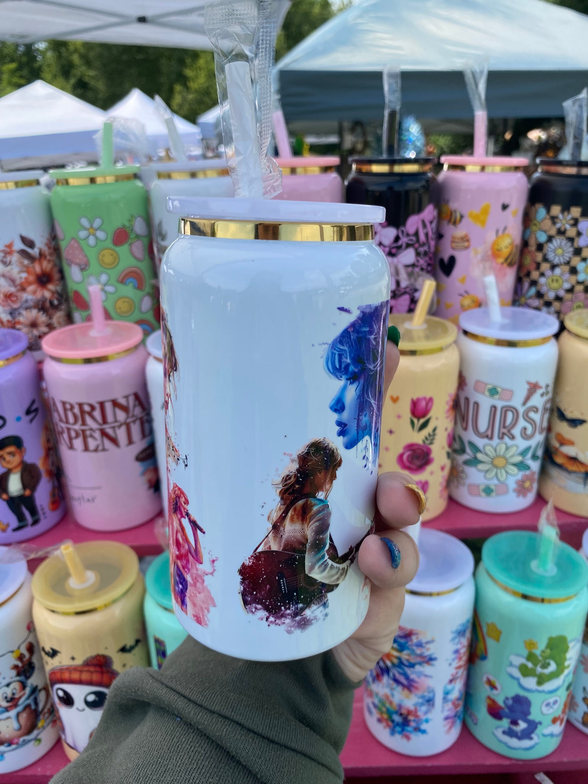 16 oz stainless steel cup. Comes with matching lid and straw. Hand wash only! Good for hot and cold beverages